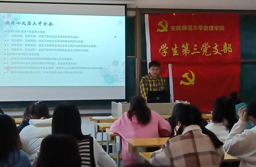 11月10日下午两点半,数理学院学生第三党支部在数学楼604教室开展了党小组集中学习活动。此次活动由朱新杰同志主持,支部正式党员、预备党员、发展对象参加了此次活动。