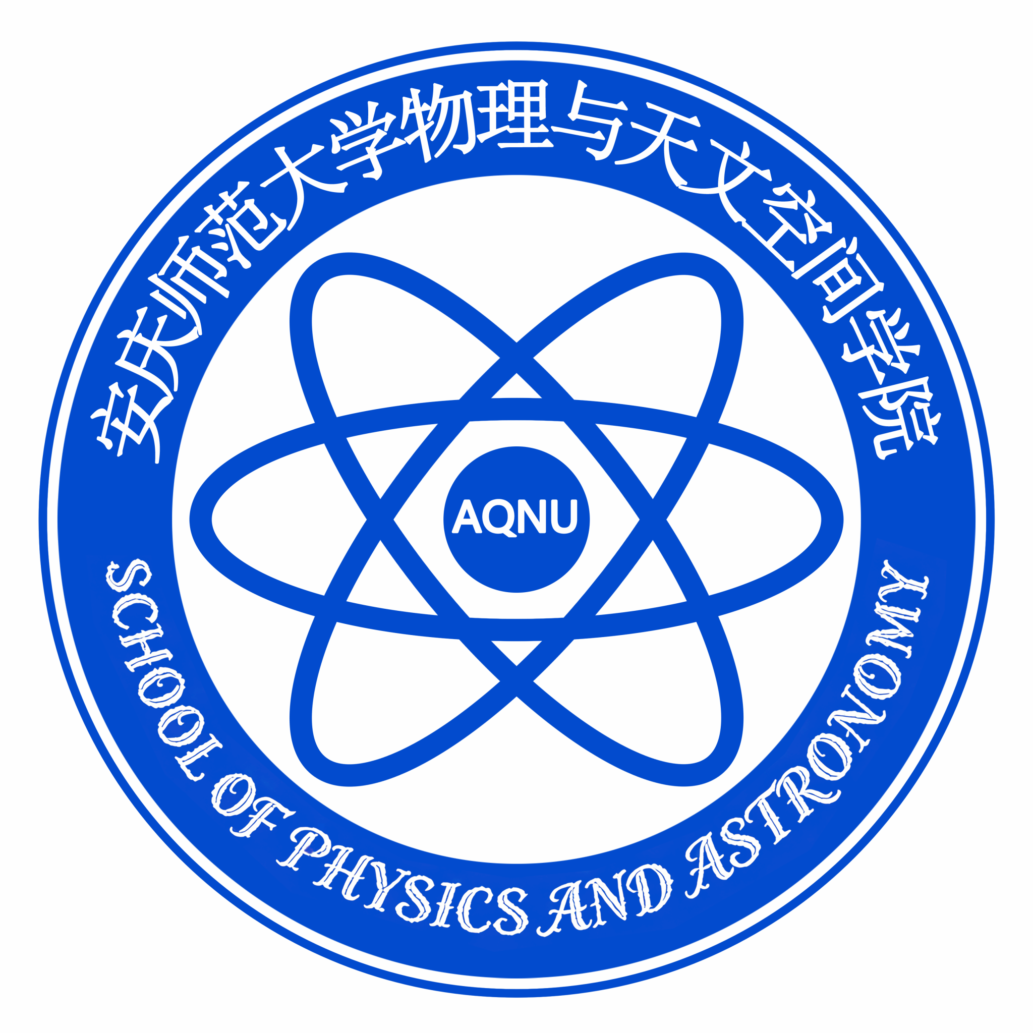 外层蓝色圆环的上部,沿圆弧排列着白色的中文宋体字“安庆师范大学物理与天文空间学院”,字体端正严谨,与学院属性契合,清晰传达了学院的中文名称。
