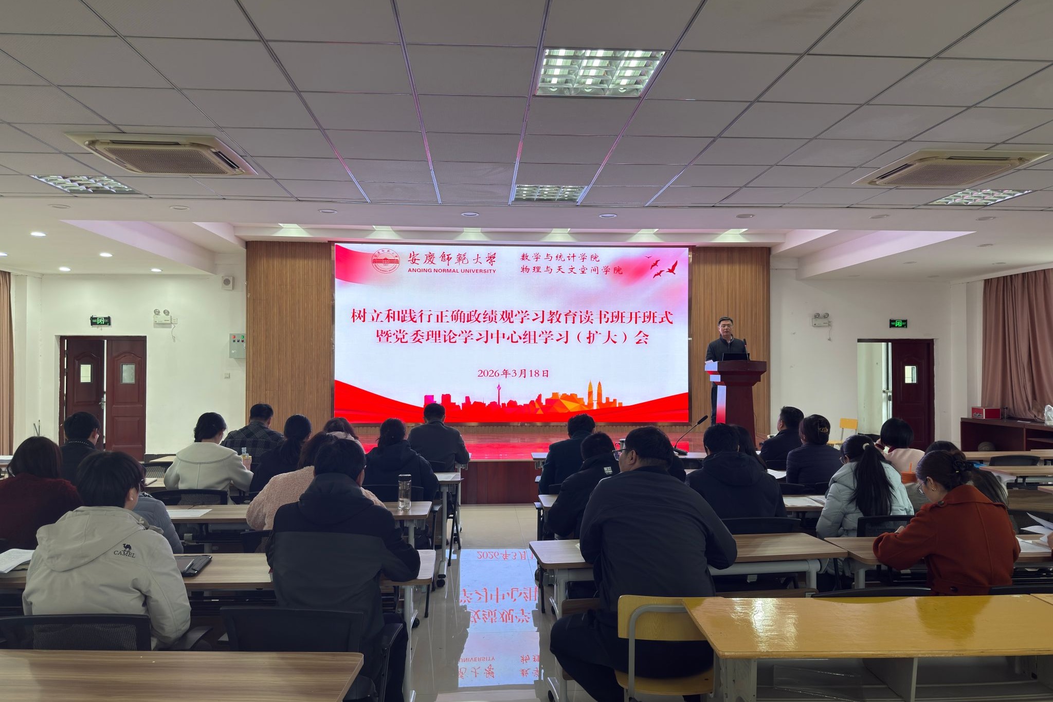 近日,物理与天文空间学院举办树立和践行正确政绩观学习教育读书班暨学院党委理论学习中心组学习会,学院党政领导班子成员、各党支部书记及科级干部参加学习。学习会由学院党委书记陆健主持。