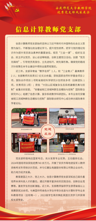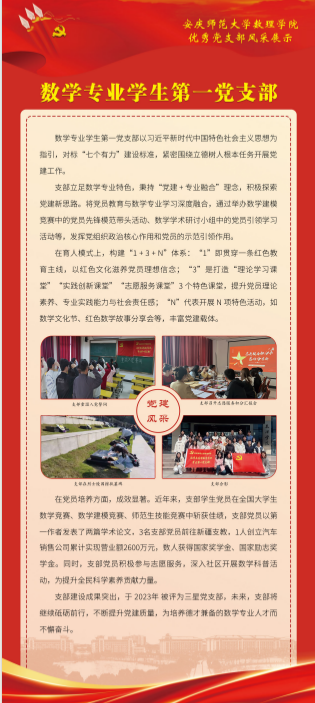 2024年,数理学院党委坚持把提高党支部建设质量作为固本之举,长远之计,持续推进党支部标准化规范化建设,切实增强党支部政治功能和组织功能,以星级党支部建设和党建“双创”工作为抓手,探索出一条“强基础、提质量、创品牌”的实践新路径。数理学院基层党建工作取得新进展新成效,涌现出一批政治功能强、支部班子强、党员队伍强、作用发挥强的优秀党支部。为总结推广优秀党支部建设经验做法,开设“优秀党支部风采展”专栏,深入宣传基层党支部在创建过程中的思路举措,充分展现党建服务学院高质量发展取得的实实在在成果,充分发挥基层党支部战斗堡垒和党员先锋模范作用。(编辑:余戡等;审核:陆健)