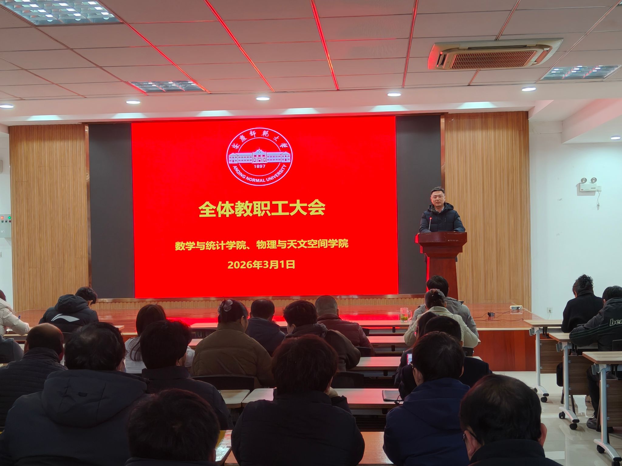 3月1日,物理与天文空间学院在I楼401报告厅召开全体教职工大会。会议旨在深入学习2026年全国、全省教育工作会议精神,传达学校2026年工作部署要求,并系统谋划与安排学院2026年主要工作任务。学院党委书记陆健,院长张海,副院长易明芳,党委副书记、纪委书记周刚,副院长陈文兵和全体教职工参加。会议由陆健主持。