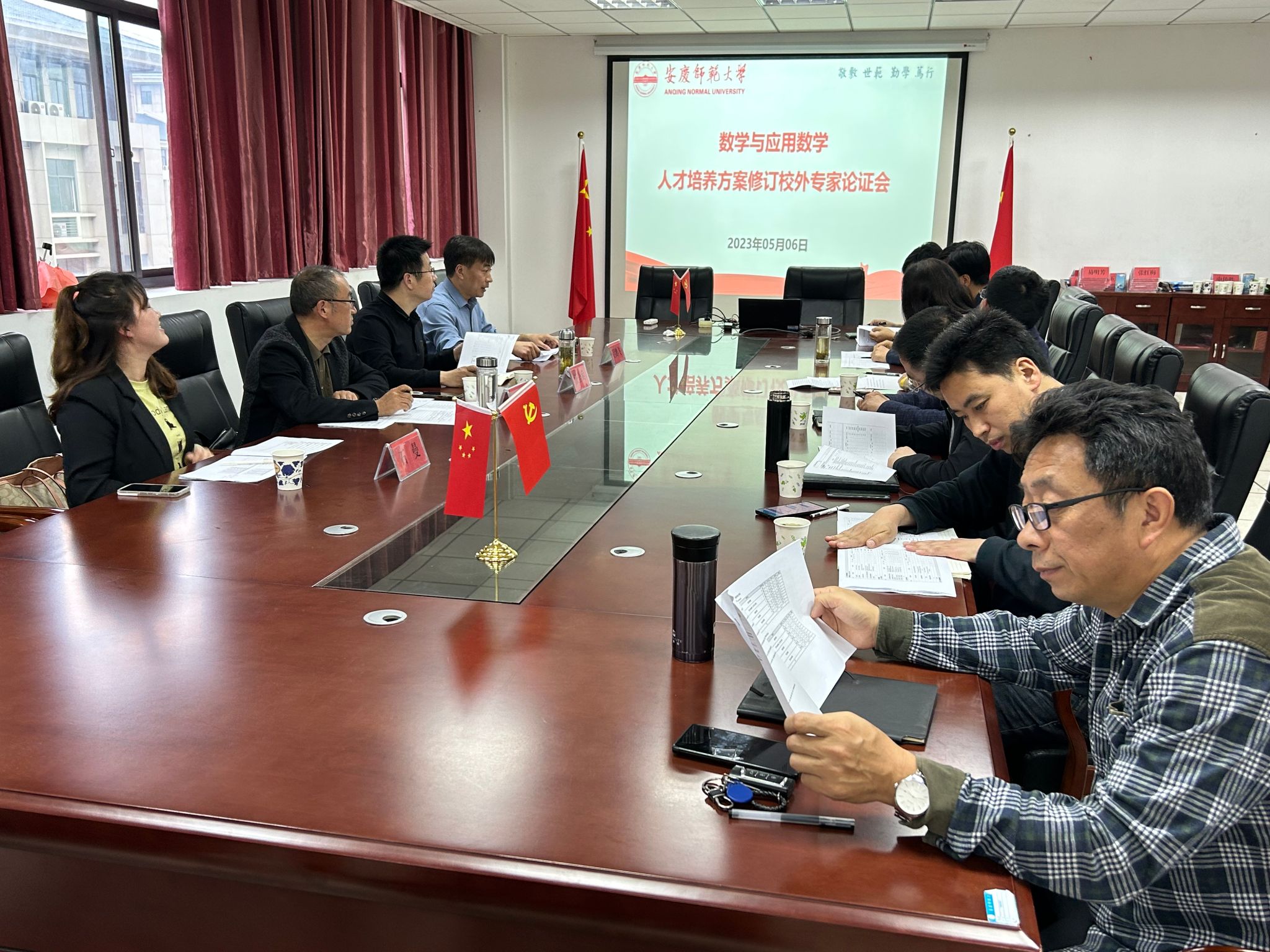 为推进一流专业的建设工作,有效提升本科人才培养质量,科学制定2023版本科人才培养方案,我院于5月6日在307会议室分别举办了数学与应用数学、物理学和科学教育等三个师范专业2023版本科人才培养方案修订校外专家论证会。安庆市石化一中人民路校区校长汪全兵、副校长徐文中,安庆市教体局数学教研室教研员何承全、物理教研室教研员王雪松,安庆市第二中学正高级教师叶玉琴,安庆市第一中学年级主任吕鹏飞、特级教师程学林和青年教师石曼等一行基础教育专家应邀来院指导2023版本科人才培养方案修订工作。副院长易明芳主持会议,我院副院长伍代勇、三个师范专业负责人及骨干教师代表、教务办公室工作人员出席会议。