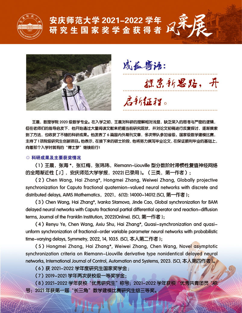 青春由磨砺而出彩,人生因奋斗而升华。数理学院对荣获2021-2022学年、2022-2023学年国家奖学金的研究生事迹进行汇总展示,激励在读研究生们坚定理想信念、锤炼过硬品格、勇于担当作为,厚植家国情怀、涵养进取品格,立志做有理想、敢担当、能吃苦、肯奋斗的新时代好青年,让青春在奋斗实践中绽放绚丽之花。(数理学院)